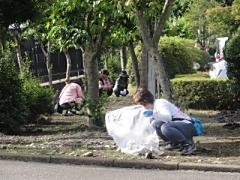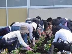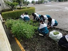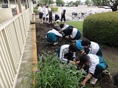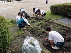 <緑化委員会の活動>放課後、花壇の草取りをしました。第1校舎のまわり5カ所の花壇の除草を分担して行っていました。この後はミニ耕耘機でうなってから、「サルビア」や「マリーゴールド」などの苗を移植します。