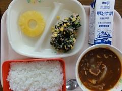 <給食コーナー「今日の献立」>今日の献立は、ご飯、牛乳、ハヤシシチュー、ほうれん草とツナのサラダ、パイン缶でした。 「ハヤシライス」は和製でしょうか? スマホの検索で調べると、定説はないようですが、洋食屋の林さんがハッシュドビーフをご飯に混ぜたことから「ハヤシ・ライス」になったようです。 私は「ハヤシライス」が苦手なのですが、矢板中の「ハヤシ」は完食でしました。 甘くないのがよかったのかもしれません。