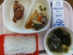 <給食コーナー「今日の献立」>ご飯、牛乳、鶏肉のピリ辛ソースがけ、野菜炒め、ワカメスープ、県民の日デザートでした。 今日は「県民の日」特別メニューでした。 特に、私が注目したのは「鶏肉のピリ辛ソースがけ」です。鶏肉の皮がパリパリに揚がっていて、これまでの鶏カラの歴史を覆すような美味しい唐揚げでした。