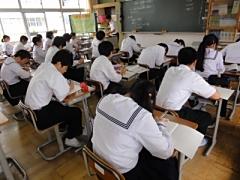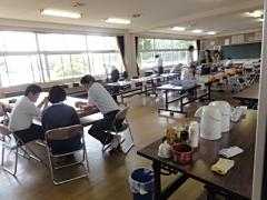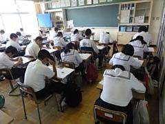 <実力テスト(3年)週間>今週は月曜日から明日の金曜日まで、第1回目の実力テスト週間です。朝、7時25分集合で、7時30分からテストがはじまります。「眠い」などど、言っている暇もなく、写真(1組、2組、3組)のように、真剣に問題に取り組む姿がありました。 明日は最後の「英語科テスト」です。 自分の現在の5教科の実力をいかんなく発揮してほしいです。