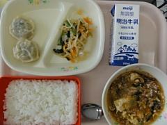 <給食コーナー「今日の給食」>ご飯、牛乳、てんぐにらまんじゅう、麻婆豆腐、もやしのナムルでした。今日のメニューは「中華」でした。 私の好きな「麻婆豆腐」が出て、ご飯の進みも幾分、はやかったです。