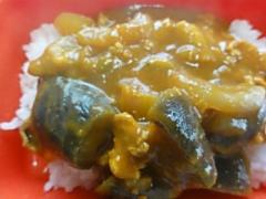 <給食コーナー「今日の献立」>今日の献立は、ごはん、牛乳、夏野菜カレー、チーズサラダ、青りんごゼリーでした。「夏野菜カレー」の具材には、ナスとかぼちゃ、ジャガイモがたくさん入っていました。