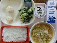 <給食コーナー「今日の献立」>今日の献立は、ご飯、牛乳、えび焼売、豆腐のサラダ(冷や奴、海藻サラダ)、根菜ごま汁でした。 中華風のメニュー3品、特に「根菜ごま汁」は私好みでサラッとした胡麻の食感と具だくさんの根菜で、今までで一番の「ごま汁」でした。