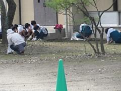 <緑化委員会の活動>放課後、花壇の草取りをしました。第1校舎のまわり5カ所の花壇の除草を分担して行っていました。この後はミニ耕耘機でうなってから、「サルビア」や「マリーゴールド」などの苗を移植します。