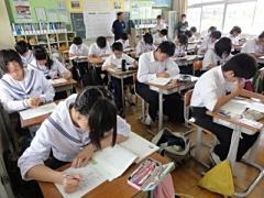 <実力テスト(3年)週間>今週は月曜日から明日の金曜日まで、第1回目の実力テスト週間です。朝、7時25分集合で、7時30分からテストがはじまります。「眠い」などど、言っている暇もなく、写真(1組、2組、3組)のように、真剣に問題に取り組む姿がありました。 明日は最後の「英語科テスト」です。 自分の現在の5教科の実力をいかんなく発揮してほしいです。