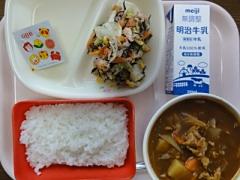 <食育コーナー「今日の献立」> ご飯、牛乳、ポークカレー、ひじきサラダ、型抜きチーズでした。 香辛料がきいた美味しい「ポークカレー」でした。