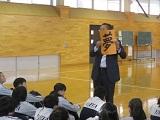 3点目は、「啐啄同時」という四文字熟語を提示し、何と読むか?意味は何だろう? と生徒に問いかけました。 生徒たちは、誰も答えられませんでしたが、3組担任の吉永先生が手を挙げ「そったくどうじ」 と答えてくれました。「入学した大学の図書館に、この文字の額が掲げられていた」ということでした。 意味は、2つあり、一つは悟りを開くお坊さんに教示をするということ。もう一つは、雛が卵の殻をつついて出てくるとき、親鶏が子ども(雛)に合わせて外の殻をくちばしで突き、殻を破るという教えのことを伝えました。