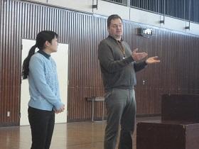 今年度4月から本日まで、お世話になったALTのグレッグ先生の離任式と今日からお世話になる高齋先生の新任式と賞状の伝達を行いました。まず、学校長よりグレッグ先生の紹介の後、代表生徒から心のこもったお別れの言葉と花束の贈呈がありました。その後、グレッグ先生からは「夢に向かってがんばってほしい。」と、心温まる励ましの言葉をいただきました。