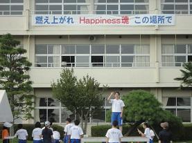 今までの練習の成果を存分に発揮した素晴らしい運動会となりました。団体種目の学年競技ではみんな一生懸命競い学級の団結力を見せ全力を出し切りました。ダンス・集団行動・ソーランでは会場の皆さんに感動を贈ろうという意気込みで、元気良く演じました。応援合戦では、各団の工夫を凝らした応援に「朱雀・白虎」の応援旗が加わり、華を添えていました。一つ一つの演技や競技の中で、見せ場を数多く作り、今年のスローガンのキーワード「Happiness魂」が実践できた1日となりました。