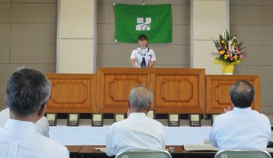 本校代表生徒は「努力と結果」と題して、3年間続けてきた部活動の経験から、必ずしも思うような結果が残せなくても、努力した成果は必ず何らかの形で成果として表われるということに気づき、「今後も努力を続けたくさんの幸せを作るという結果を目指したい。」と発表してくれました。大勢の前での発表は、ずいぶん緊張したようでしたが立派に発表できました。結果は、優秀賞を頂きました。
