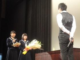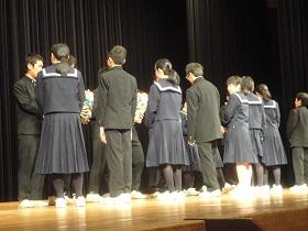 2月21日(火)矢板市文化会館大ホールを会場に、生徒会主催の「謝恩・送別会」が行われました。はじめに「謝恩会」があり、職員には3年のバルガス君から「感謝のことば」があり、全職員に花束をいただきました。その後の「送別会」では、生徒会長の古市君から3年生に対して「送別のことば」があり、送別のアトラクションでは、映画「シンゴジラ」を鑑賞しました。映画鑑賞後には、2学年学級委員長小川君からの「3年生へのメッセージ」と各学級に「花鉢」の贈呈がありました。最後に全校生で「旅立ちの日に」を合唱しまし、前生徒会長の内山さんのお礼の言葉で締めくくられました。