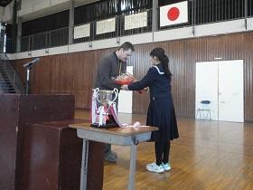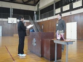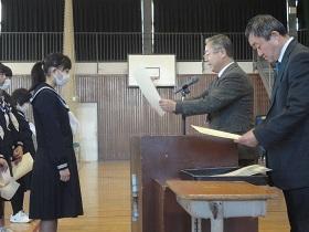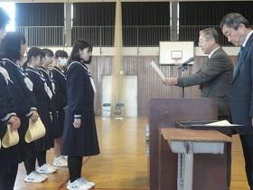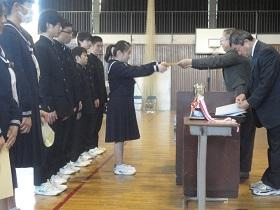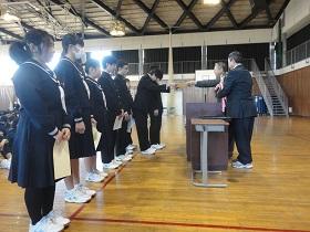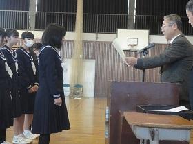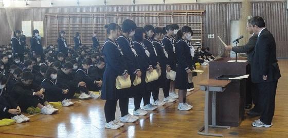続いて、校内書初展の表彰と各種大会・コンクールでの入賞者の賞状の伝達を行いました。入賞者の皆さんおめでとうございました。詳細については、後日、“学校だより”で紹介したいと思います。