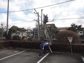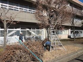 先週から、矢板市シルバー人材センターによる樹木の剪定が始まりました。校舎前の“松の木”の剪定や中庭の“ソネ”や“モッコク”の枝おろしを行っています。今日が最終日ということで、駐車場脇の“コブシ”や校庭の“トチノ木”などの枝おろしを行ってくださいました。まだまだ高原下ろしが吹き付ける肌寒い中、ご協力をいただき感謝いたします。ありがとうございました。