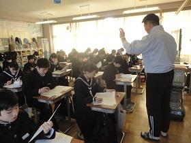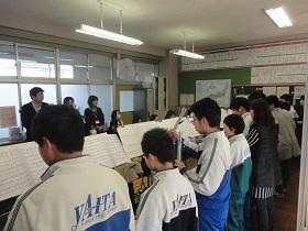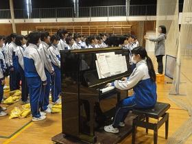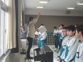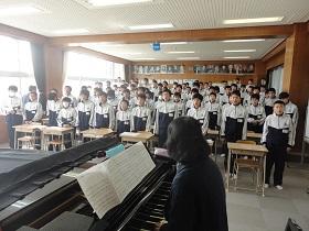 3月8日の「卒業式」に向け、卒業記念合唱“大地讃頌”の練習が行われています。現在は、音楽の授業での練習を中心に、昼休みにはパートごとの練習も行われています。混声四部の合唱曲で、1年男子がテノール、2年男子がバス、1年女子がソプラノ、2年女子がアルト、3年生は4つのパートに分かれています。それぞれのパートの音取りも順調に進んでいます。