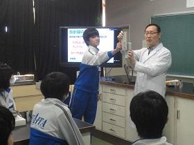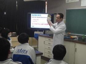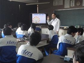 本日、3年生を対象に、理科の授業で「エネルギー教育」における放射線出前授業を行いました。エネルギー教育全国協議会から舟生先生を講師としてお招きし、「放射線の基礎的な性質と放射線の利用」について授業をしていただきました。内容は、「放射線の基礎として、放射線についての基本的な内容と人への影響について理解し、放射線が広く日常に利用されていることや、エネルギーおよび環境に深く関わりがあることを理解する」というものです。放射能と放射線の違いを電球に例えて「光が放射線で、光を出す能力が放射能。放射線が人体に与える影響を表す単位がシーベルト」などと解りやすく説明してくれました。講義の他に「霧箱によるアルファ線とベータ線の軌跡の観察」も行い、放射線が自然界に存在することやその性質について実験を通して理解しました。また、私たちの暮らしの中の広い分野で、放射線が利用されていることのメリット、デメリットを学びました。