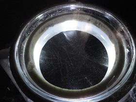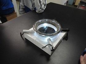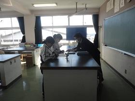 放射線の観察では、アルコールの蒸気を充満させたガラスの器の中で、放射線が白い線となって飛び交うのを確認すると「すごい、見えた」などと、声を上げ、生徒たちは興味をもって取り組んでいました。