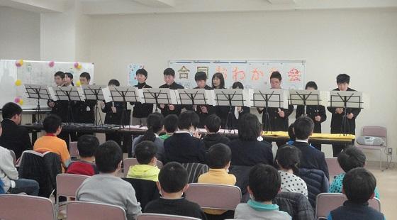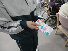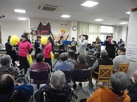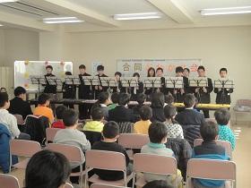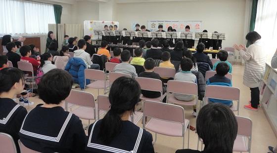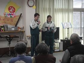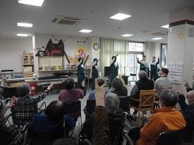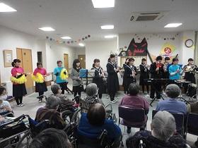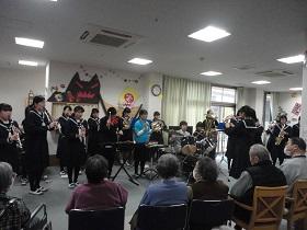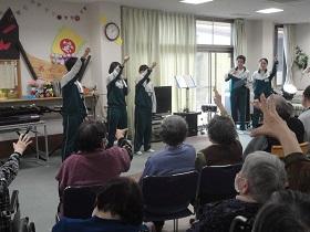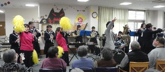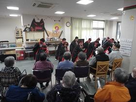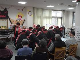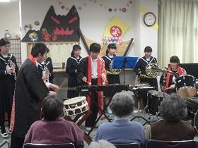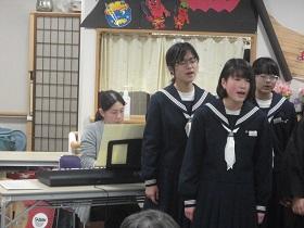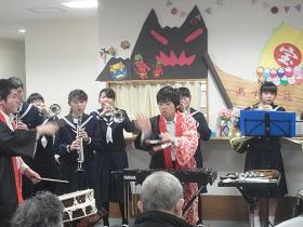 年末の「八汐苑」訪問に続いて、2月25日(土)生徒会福祉委員会と吹奏楽部、合唱部による「あずみ苑」への訪問ボランティアを行いました。入所しているおじいさんやおばあさんたちが、福祉委員との“じゃんけんゲーム”に参加したり、“よさこいソーラン”や合唱部・吹奏楽部の演奏では、手拍子をしたりしながら笑顔で聴いてくれていました。合唱部の演奏曲目は、おじいさんやおばあさんたちが聴いて楽しめるように、心和む唱歌・童謡が中心でしたが、「おぼろ月夜」や「涙そうそう」の演奏では、一緒に口ずさむ姿も見られました。吹奏楽部の「明日があるさ」と「上を向いて歩こう」や合唱部とのコラボレーションステージの「冬の童謡メドレー」の曲でも歌いながら手拍子を打ってくれました。最後の吹奏楽部の演奏では、北島三郎の「祭り」が演奏され、会場は盛り上がりを見せていました。