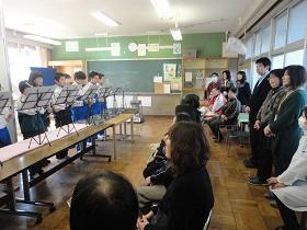 また、帰りの会の終了時には、校内放送で式歌“仰げば尊し”と“大地讃頌”を流しての、クラスごとの一斉練習も始まりました。初日の今日は、“大地讃頌”を練習しましたが、指揮者を務める工藤君のいる3-2の様子を紹介します。