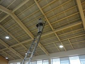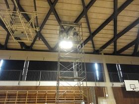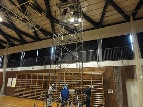 また、武道場もランプの交換を行いましたが、こちらは、ハシゴを延ばしての交換作業でした。不安定な状況でもキッチリと仕事をこなせるのが、プロの作業技術だと思いました。