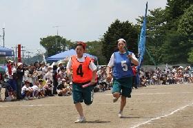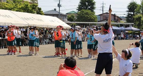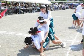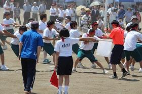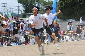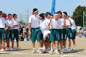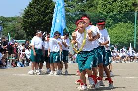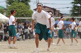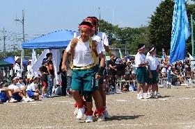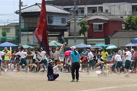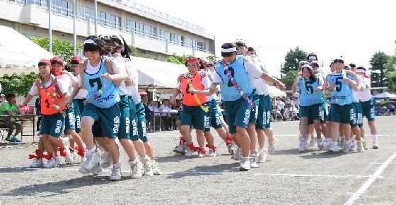 「お花いっぱい足いっぱい」は、3年生の伝統種目となっている通称“百足リレー”です。朝練の成果が発揮され、リズミカルに掛け声をかけながら疾走するグループ、思うように足が合わず走れなかったり、バランスを崩して転倒したりする組も見られました。結果は、1位(2組)、2位(3組)、3位(4組)で赤組の勝利でした。