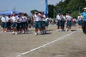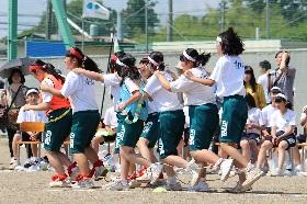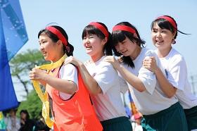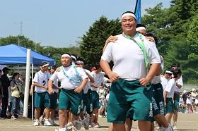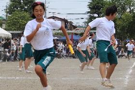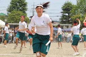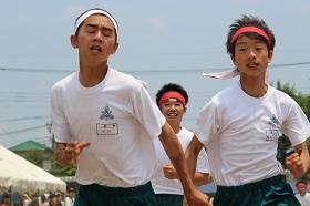 入場には、流し踊り風に「矢板音頭」を踊りながら入場しましたが、突如にわか雨が降り出し“水もしたたる・・・”がドンピシャでした。「Happiness」では、雨に負けないくらいの元気いっぱいの力強い踊りで、クラスごとのパフォーマンスでも一人一人が表情よくタイトルにふさわしい矢中生をアピールしていました。更に、退場でも「いきものがかり」の『じょいふる』に合わせて弾けるように退場する姿からも完全燃焼できました。