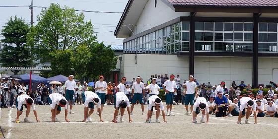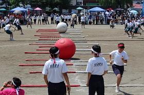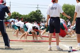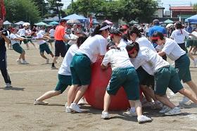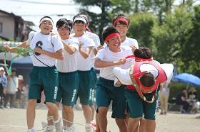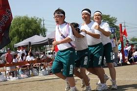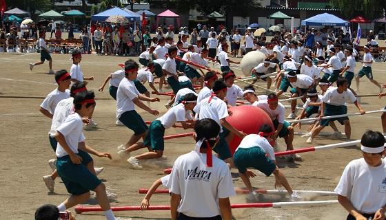 「つかみ愛・とり愛・うばい愛」は、基本形は“棒引き”ですが、棒だけでなくいろいろなアイテムを奪い合う競技種目です。綱(30点)、大玉(20点)、ゴールデン棒(20点)、ノーマル棒(10点)というように設定されており、自軍の陣地内に運びこめばゲットです。高得点を狙ってアイテムを目がけて突進する姿は見ごたえがある競技です。