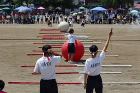 各学年女子生徒の中から選ばれた選手が学年別に紅白に分かれ、6つのカゴを目がけてまりを投げ入れました。一斉にかごを目がけてまりを投げ上げる光景は圧巻です。
