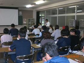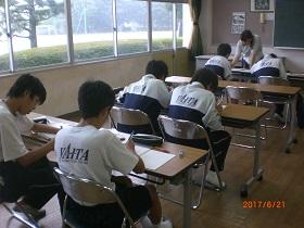 6月14日の5校時には全体指導を行い、進路指導主事から「キャリア・スタート・ウィーク」の趣旨や目的などについて説明しました。生徒は、真剣な表情で話に聴き入っていました。