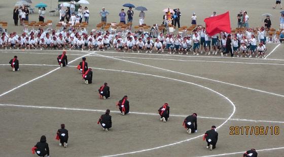 そして、当日の大きなハプニングは急なにわか雨です。最後の種目の“大蛇の寝返り”を始めた頃から、雨足が強くなり始め、全生徒が寝終わる頃には大粒の雨が横たわる大蛇に叩きつけるように落ちてきました。その後一斉に起き上がり、大蛇から“大ムカデ”に変身して、雨を物ともせず大きな掛け声をかけながら退場し組体操が無事終了しました。雨の中の「組体操」は、生徒たちにとって忘れられない思い出になるものと思います。