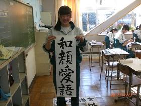 書き初め展覧会は、「文字を正しく整えて読みやすく丁寧に」書くことを大切にする心情を育て、日本の文字文化の振興発展に寄与することを目的としているということです。因みに、平成30年歌会始のお題が「語」と定められたことにより、平成30年の中学生の課題は、1学年「故事成語」、2学年「春林鳥語」、3学年「和顔愛語」です。
