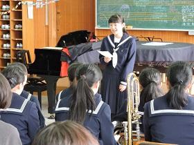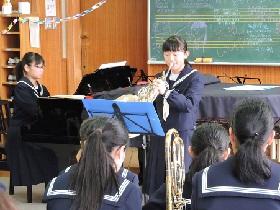 発表では、部員一人一人が、担当している楽器での独奏曲や重奏曲を披露してくれました。体調を崩してしまい、全員が参加できなかったことは残念でしたが、OBが急遽演奏してくれたり、最終演奏では、部員全員で「春メドレー」を披露してくれたりと、終始和やかな雰囲気で心温まるコンサートでした。会場は、大きな拍手で盛り上がりをみせ、2017年を締めくくる部活動となりました。