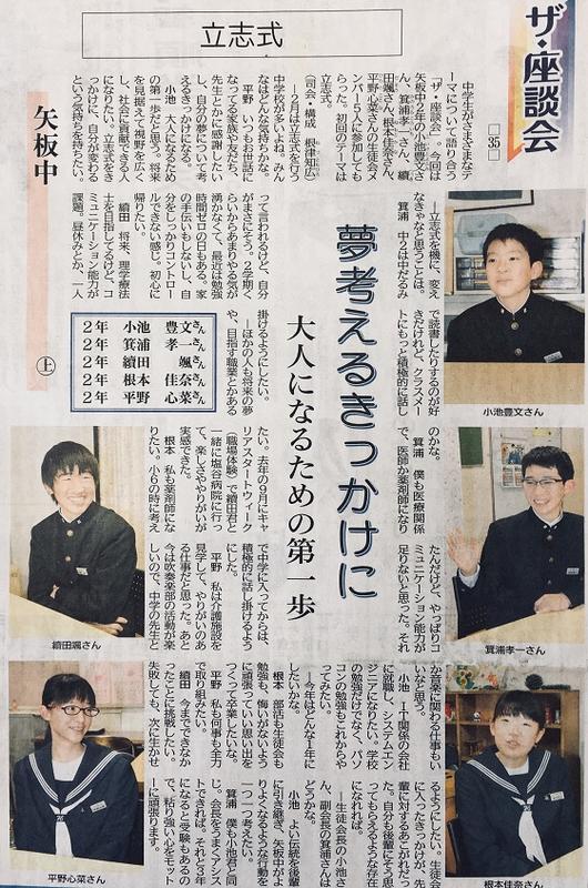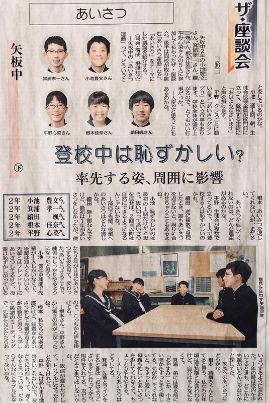 今朝は“あいさつ運動”が行われ、生徒会役員が寒さにも負けず「おはようございます!」と笑顔で声をかけていました。日曜日の下野新聞には、先週に引き続き“しもつけ中学生ニュース”に、本校生徒会役員(2年生)による「ザ・座談会」の記事も掲載されていました。今回は「あいさつ」をテーマに意見交換を行いましたが、生徒会が率先して“あいさつ運動”に取り組む様子がうかがえる内容でした。