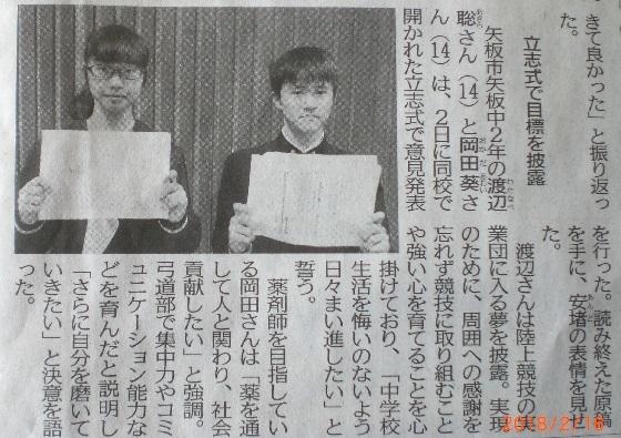先日も紹介したように、立志式において立志を迎えた生徒代表による「意見発表」を行いました。本日付け「下野新聞」の県北・日光版の『けさの顔』に、読み終えた原稿を手にした2人の写真と意見発表の概要が掲載されていました。