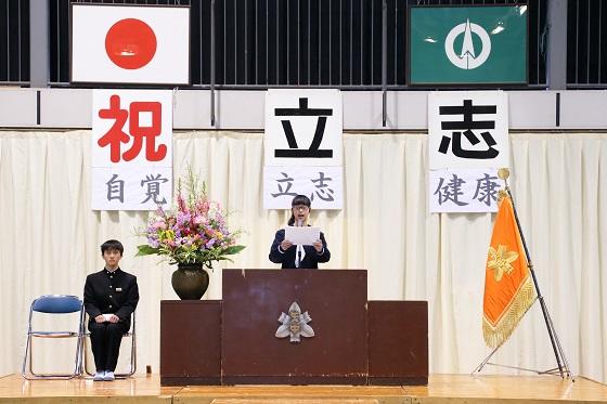 2月2日(金)午前9時15分より、本校体育館において2年生の「立志式」を行いました。昨夜からの雪の影響が残り、厳しい冷え込みと足元が悪い中での行事となり、来賓や保護者の皆様には大変ご迷惑をおかけいたしました。式典では、多くの来賓の方々と保護者や1年生が見守る中、学校長式辞や来賓からの祝辞、生徒代表による「励ましのことば」や「立志の誓いのことば」など、真剣な態度で臨む厳粛な式になりました。