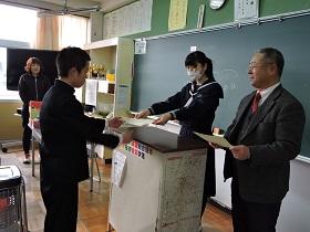 2月22日(木)の午後、矢板市文化会館大ホールを会場に、生徒会主催の「謝恩・送別会」が行われました。はじめに「謝恩会」があり、職員には3年の藤田君から「感謝のことば」と、全職員に花束をいただきました。その後の「送別会」では、新生徒会役員が工夫を凝らした映像でのオープニングセレモニーから始まり、生徒会長の小池君が3年生に対して「送別のことば」を述べました。送別のアトラクションでは、映画「チアダン」を鑑賞しました。映画鑑賞後には、学級委員会の企画で「3年生へのメッセージ」と各学級に「花鉢」の贈呈がありました。最後に前生徒会長の古市君のお礼の言葉で締めくくられました。