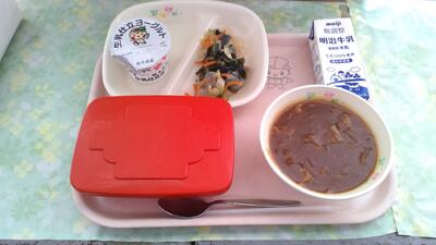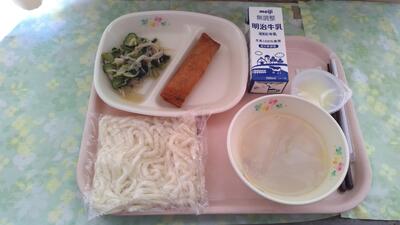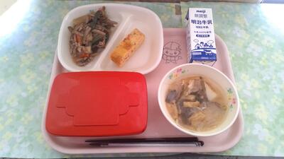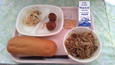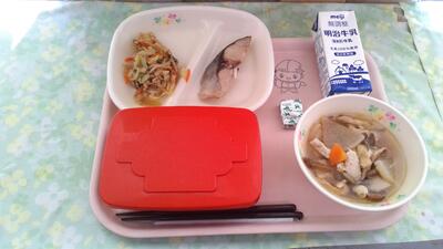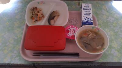 1月24日から1月30日の一週間 は、全国学校給食週間 です。学校給食 は、当時貧しい子 どもたちのために、山形県 の私立忠愛小学校で始まりました。今日は明治22年、最初の給食を再現した献立となっています。当初の献立は、おにぎりと焼き魚、漬物だったそうです。現在では単なる栄養補給のみならず、子どもたちへの食育の一環として、全国の小中学校で給食が提供されています。今日は、おにぎりではなく、味付けのりでごはんをはさみ、セルフのり巻きにして食べました。また、今日の味付けのりは県内のマスコットキャラクター入りで、選ぶのに迷いました。