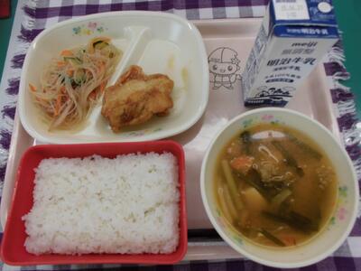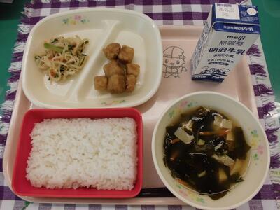 今日の献立は、「ごはん 鶏肉のレモンソース 中華風春雨サラダ 豆腐チゲスープ 牛乳」でした。