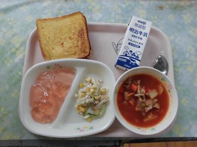 今日の献立は、「フレンチトースト ポークビーンズ かんぴょう入りサラダ いちごのゼリー 牛乳」でした。