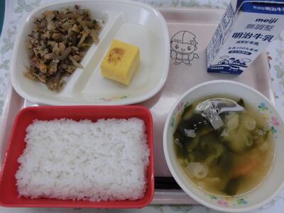 わかめには、アルギン酸という栄養成分が含まれています。アルギン酸は食物繊維のひとつで、わかめのヌルヌル成分です。体の調子を整える働きがあります。給食では、ナムルに使われていました。