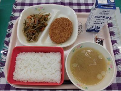 今日の献立は、「ごはん 豚肉コロッケ 五目きんぴら なめこと豆腐のみそ汁 牛乳」でした。