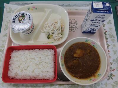 今日の献立は、「ごはん ひき肉とかぼちゃのカレー 切干大根ときゅうりのサラダ ヨーグルト 牛乳」でした。
