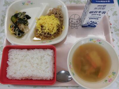 今日の献立は、「和風ビビンバ丼 もやしとわかめのナムル かんぴょうの中華スープ 牛乳」でした。