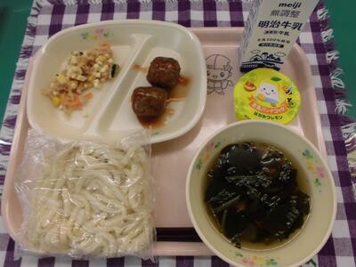 今日の献立は、「山菜うどん 野菜肉団子 ツナと大根のサラダ 豆乳パンナコッタ 牛乳」でした。