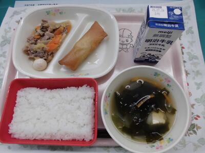 今日の献立は、「中華丼 米粉の春巻 わかめと豆腐のスープ 牛乳」でした。