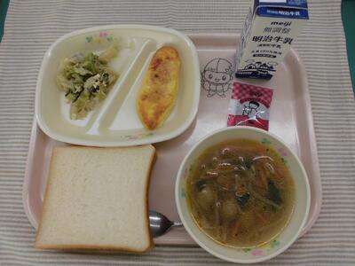 今日の献立は、「食パン マーシャルビーンズ トマトオムレツ じゃことチーズのサラダ 春雨スープ 牛乳」でした。