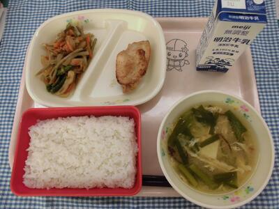 今日の献立は、「ごはん 豚にらもやし炒め 小松菜のツナあえ 根菜のみそ汁 牛乳」でした。