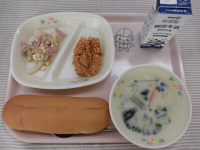 今日の献立は、「ごはん あじカツ もやしとのりのあえもの 豆乳仕立ての野菜汁 牛乳」でした。