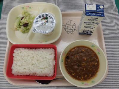 今日の給食は、「ボロネーゼハヤシライス ビーンズサラダ ヨーグルト 牛乳」でした。