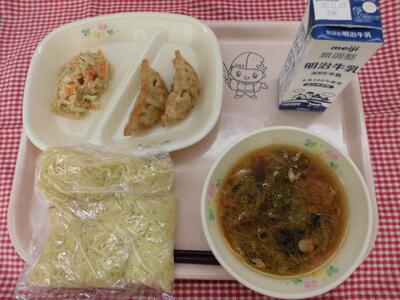 今日の献立は、「しょうゆラーメン 牛乳 揚げギョーザ バンバンジーサラダ」