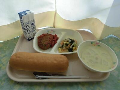 今日ん献立は、「県産小麦のコッペパン トマトソースハンバーグ わかめのサラダ 白菜のクリームスープ 牛乳」でした。